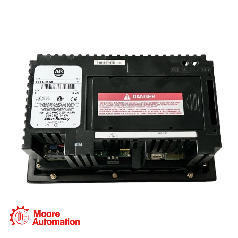 This operator terminal is powered by an external 85-264V AC supply voltage and has a 5.5-inch display with embedded Data Highway Plus (DH+) communication and RS232 printer ports. It has ten (10) Function keys and a Touchscreen operator interface.